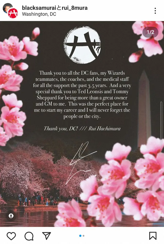 ワシントンDCを流れるポトマック川の桜並木をイメージしたバックに、英語、日本語の2カ国語で心からの感謝を表現。「DCのファンの皆さん、ウィザーズのチームメート、コーチ陣、メディカルスタッフの皆さん、ウィザーズに関わる全ての関係者の方々、3年半のサポート本当にありがとうございました」と書き出した。