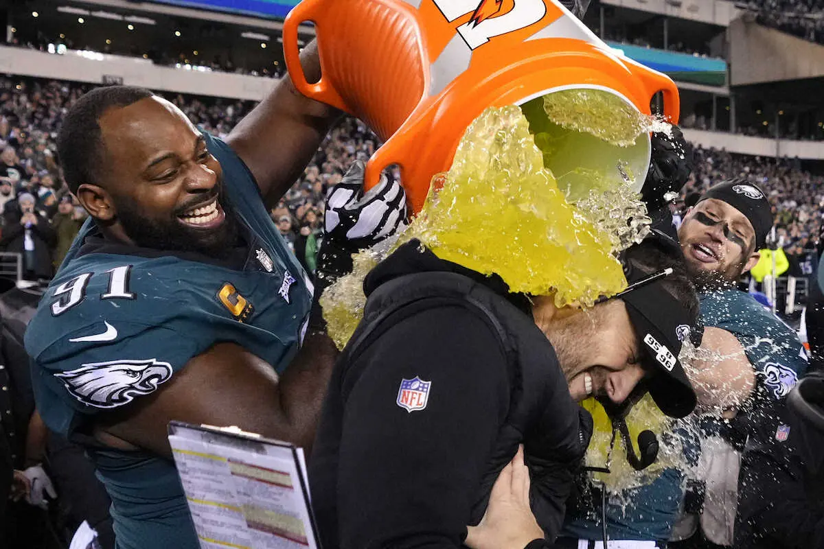 シリアンニ監督にスポーツドリンクのシャワーを浴びせるイーグルスのDTコックス(AP)