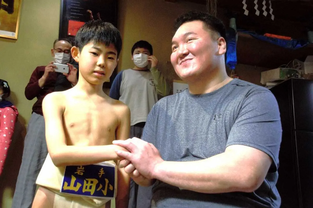 海外から招待されたウクライナ、ハワイ、モンゴルチームと一緒に、岩手県山田町の3人も参加。小学6年生の佐藤真士くんは、宮城野親方と運命的な縁があった。佐藤くんは11年3月2日に生まれ、退院予定だった3月11日に東日本大震災で被災。同年6月、慰問に訪れた当時の横綱・白鵬に抱っこしてもらったことがあった。相撲をやっていた父・哲也さんの影響で小学2年生の頃から相撲を始め、同親方との交流も続いた。今回が白鵬杯初参加。「偉大な人」と憧れる大横綱から直々に指導を受け「基本技を教えてもらって勉強になった。(明日)白鵬さんの前で相撲を取るのは緊張するけど、良い相撲を見せられるように。まずは1勝できるように」と大会へ意気込んだ。