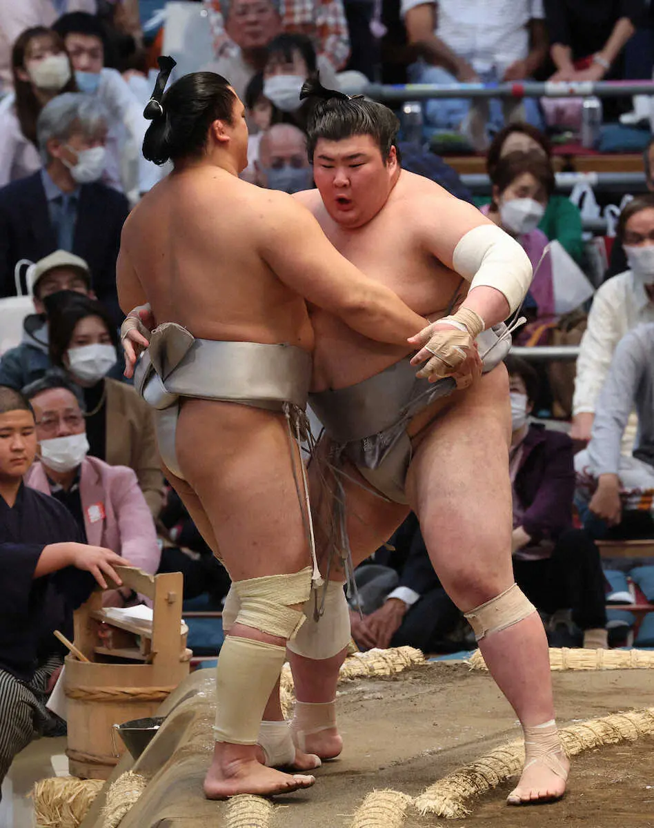 今場所から新しい銀色の締め込みを使用。地元・静岡県熱海市の後援会から贈られたもので「やっぱり気合入りましたね」と応援を力に変えた。「自分がどんなに苦しくても後援会の人たちは見守ってくれている」。地元への感謝の思いを強め、3場所ぶりの勝ち越しへ向けて幸先の良いスタートを切った。