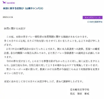 昨年の春高バレー優勝の日本航空高 監督の体罰を謝罪、処分は厳重注意「今後起らぬように研修を充実」