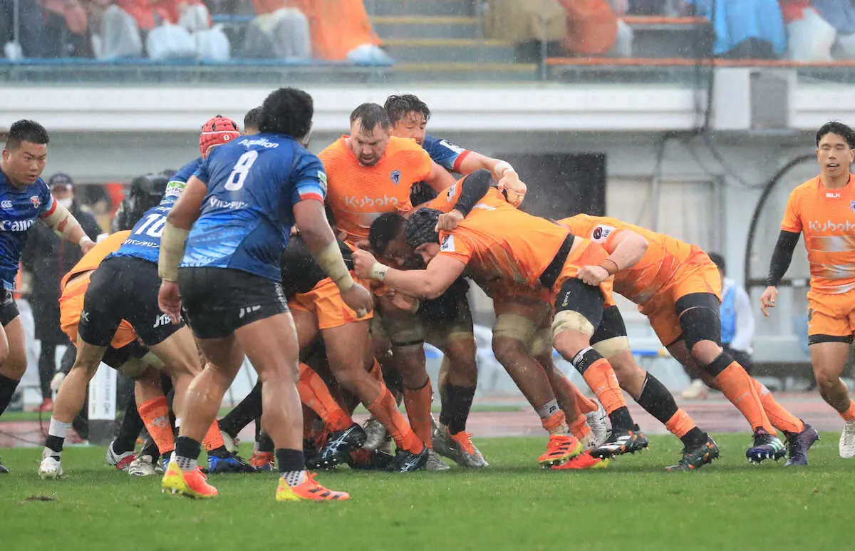 ≪雨で展開力不発 3敗で4位後退≫横浜は雨天でボールをダイナミックに動かす攻撃の威力がそがれて3敗目。沢木敬介監督は「こういう展開でボールを動かすのが難しかった。遂行力が相手が上だった」と振り返った。前半はゴールラインには迫るものの、ハンドリングエラーもあり得点できず。ロースコアの展開で1トライが大きくものをいう試合だっただけに、SO田村も「前半に取れなかったのが痛かった」と反省。4位に後退し、初の4強入りへ正念場を迎える。