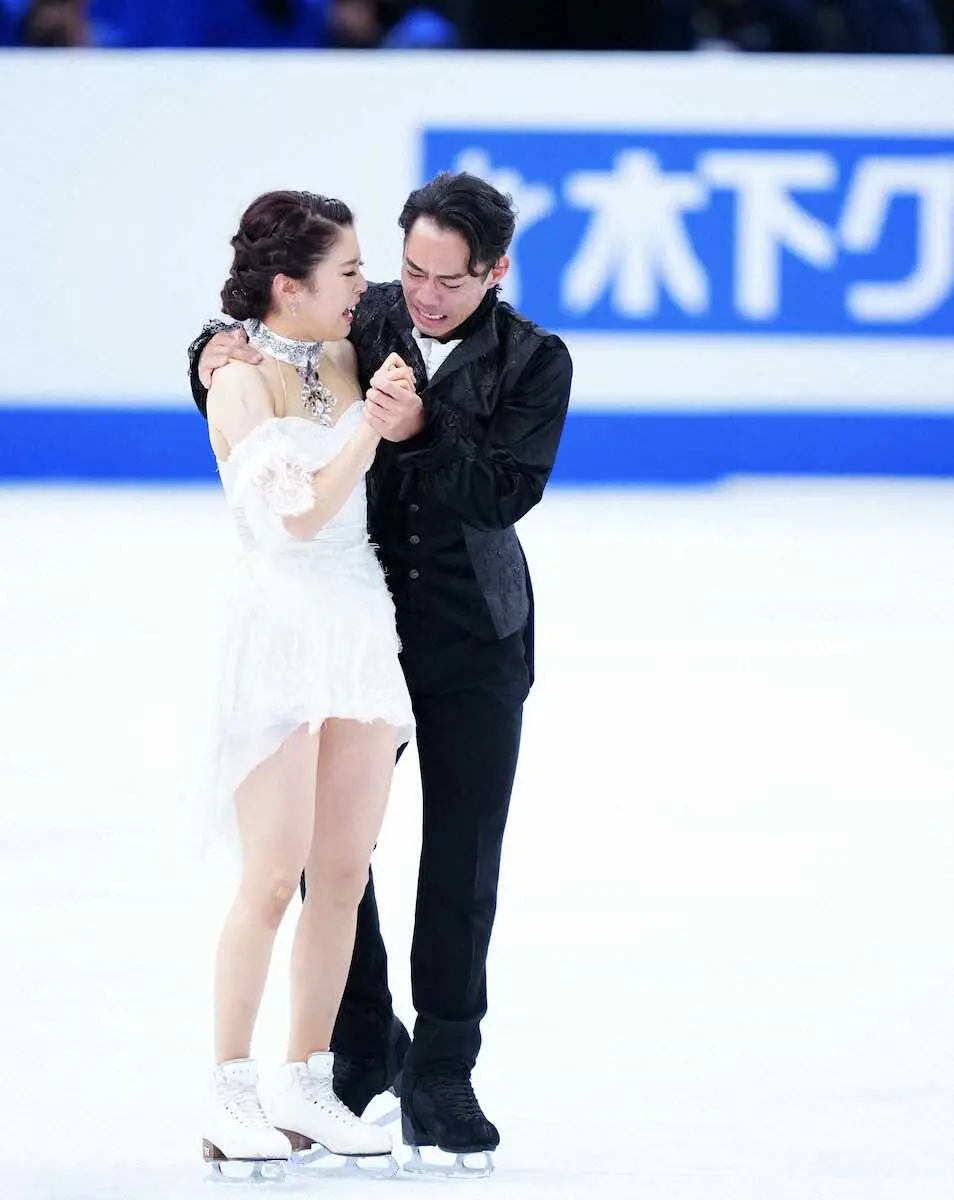 <世界フィギュア第4日>アイスダンス・フリー、演技を終え涙する村元哉中、高橋大輔組(撮影・小海途 良幹)