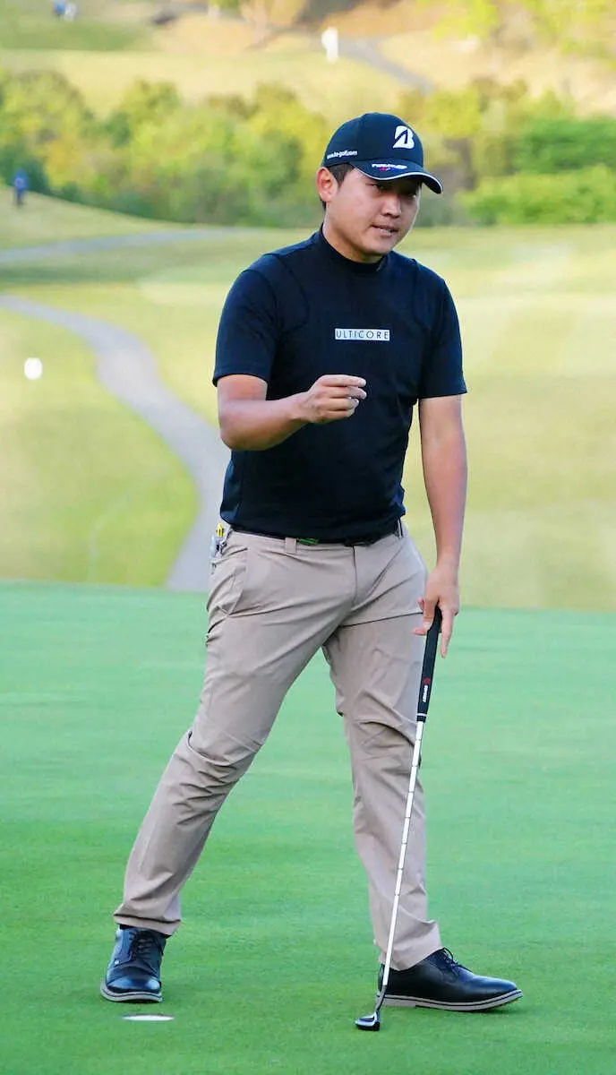 インスタートの10、11番で幸先よく連続バーディー。前半は6つ伸ばして折り返した。後半は4番で1打目をOBとするなど我慢の展開が続くも、9番パー5で狙い通りバーディーを奪取。首位タイで初日を終え、「いいゴルフができた」とうなずいた。