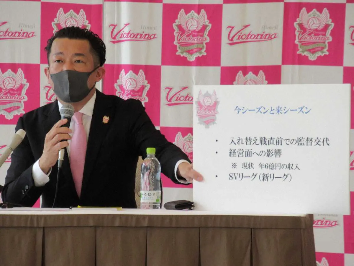 バレーボール・Vリーグで2部に降格したヴィクトリーナ姫路が14日、姫路市内で「謝罪会見」を開いた。