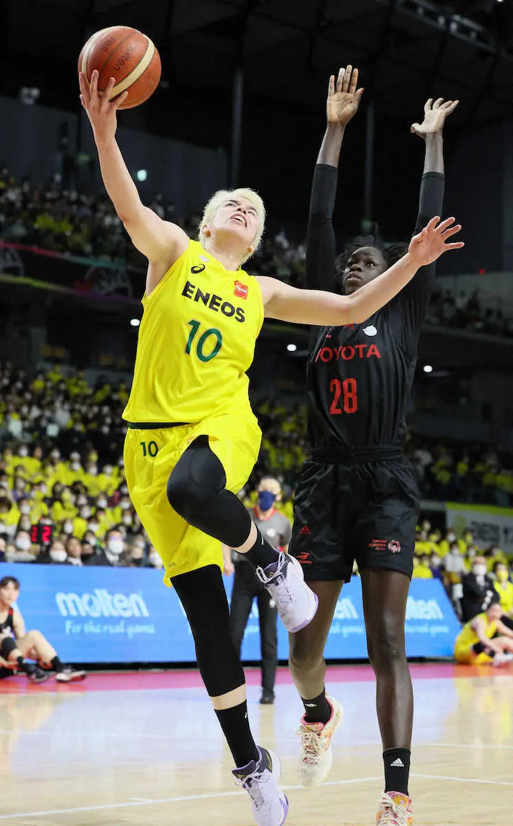バスケットボール女子Wリーグプレーオフは2戦先勝方式の第2戦が東京・武蔵野の森総合スポーツプラザで行われ、4年ぶり23度目の優勝を狙うENEOSが3連覇を目指すトヨタ自動車に74―65で勝利して1勝1敗とした。大黒柱の渡嘉敷来夢(31)が17得点14リバウンドの活躍。昨季までトヨタ自動車所属の長岡萌映子(29)が17得点7リバウンドを記録した。トヨタ自動車は山本麻衣(23)が4本の3点シュートを含む両チーム最多22得点をマーク。第3戦は17日に行われる。