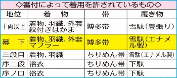 ▽力士の服装 番付が上がるごとに力士が身に着けるものは立派になっていく。入門したばかりの力士は部屋支給の浴衣に足元も下駄。冬場は寒さが身に染みるが、関取になれば紋付きはかまや外套(がいとう)着用も許され、畳張りの雪駄を履ける。相撲協会によると「規定で定められてはおらず、幕下に昇進したら博多帯を贈られるなどの慣習が今日まで受け継がれている」という。行司の装束の生地、履物、持ち物などは規定で決められている。