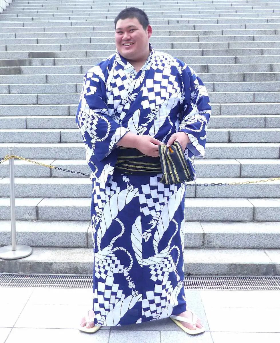 中村はこの日初めて着る着物に1メートル92、177キロの巨体を包み、力士の風格を漂わせた。「いよいよだなという気持ちでいっぱい。本当にお相撲さんになったんだな」と実感を込めた。幕下10枚目格付け出しでデビューのため、新弟子ながら幕下以上の力士に着用が認められる絹の博多帯を締めた。帯の端には「稀勢の里」の文字。師匠の二所ノ関親方(元横綱・稀勢の里)が現役時代に使用していた物を譲り受けた。