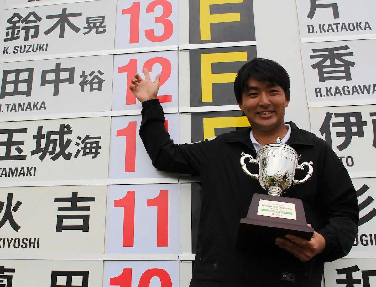 初勝利の感想はいかにも新人らしかった。「まさかこんなに早く勝てるとは」。自ら驚く下部ツアー参戦2試合目のスピード優勝だが逆転の足取りにはベテラン並みの落ち着きがあった。「最終日は伸ばし合いになる」と巡ってきたチャンスは確実につかみ5バーディー、ノーボギー。連日の67をマークして首位だった田中裕を1打差で退けた。