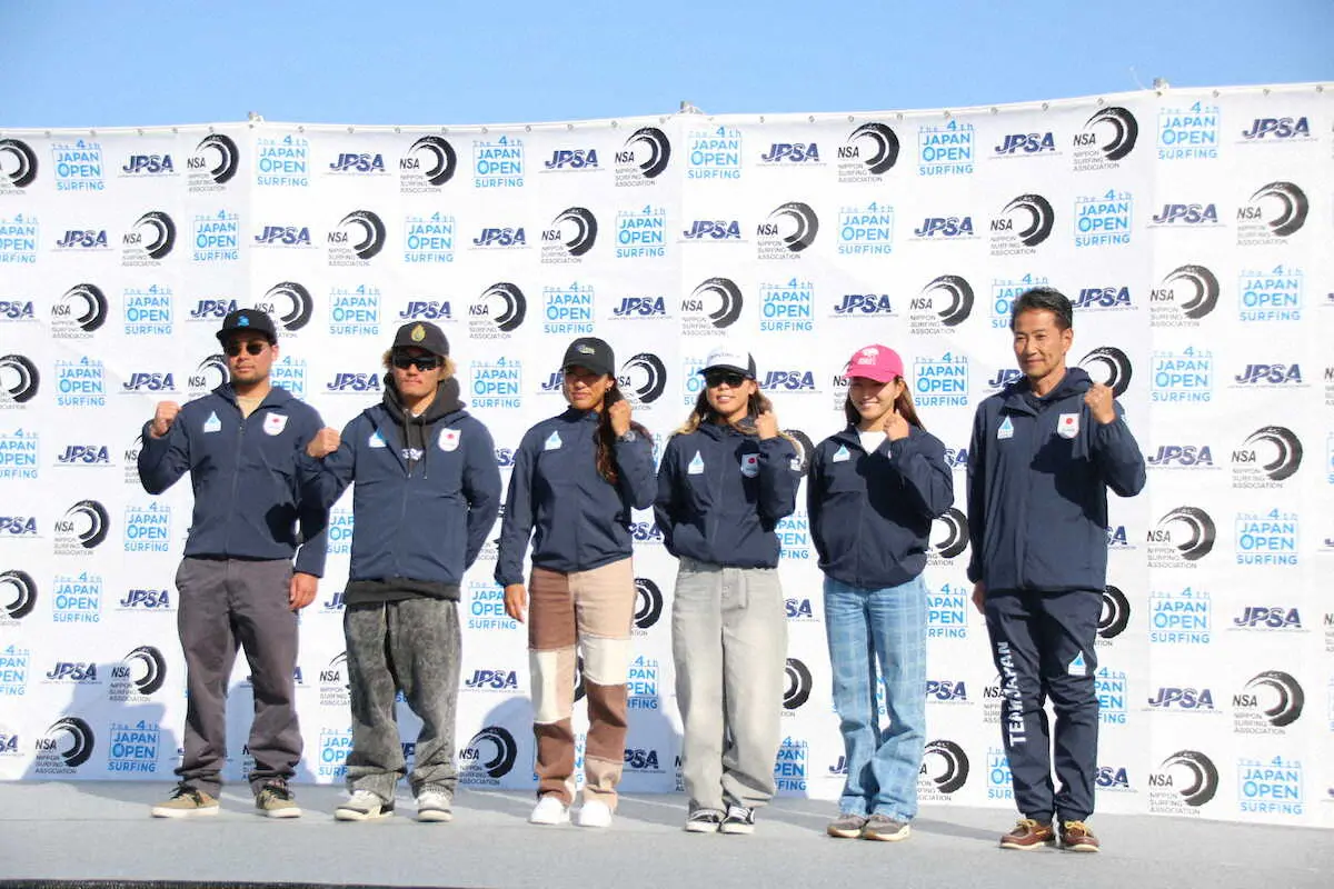 <サーフィンジャパンオープン>ワールドゲームズの日本代表に選ばれた(左から)稲葉玲王、脇田泰地、前田マヒナ、都筑有夢路、松田詩野と、日本代表の宗像富次郎監督