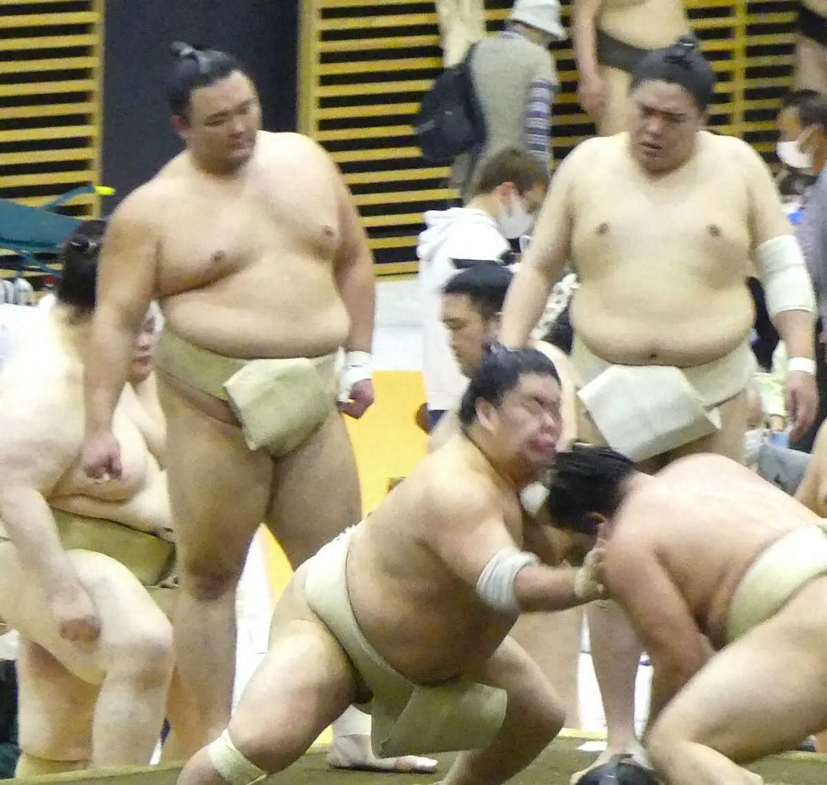 申し合い稽古に参加した朝乃山(左)=撮影・前川 晋作