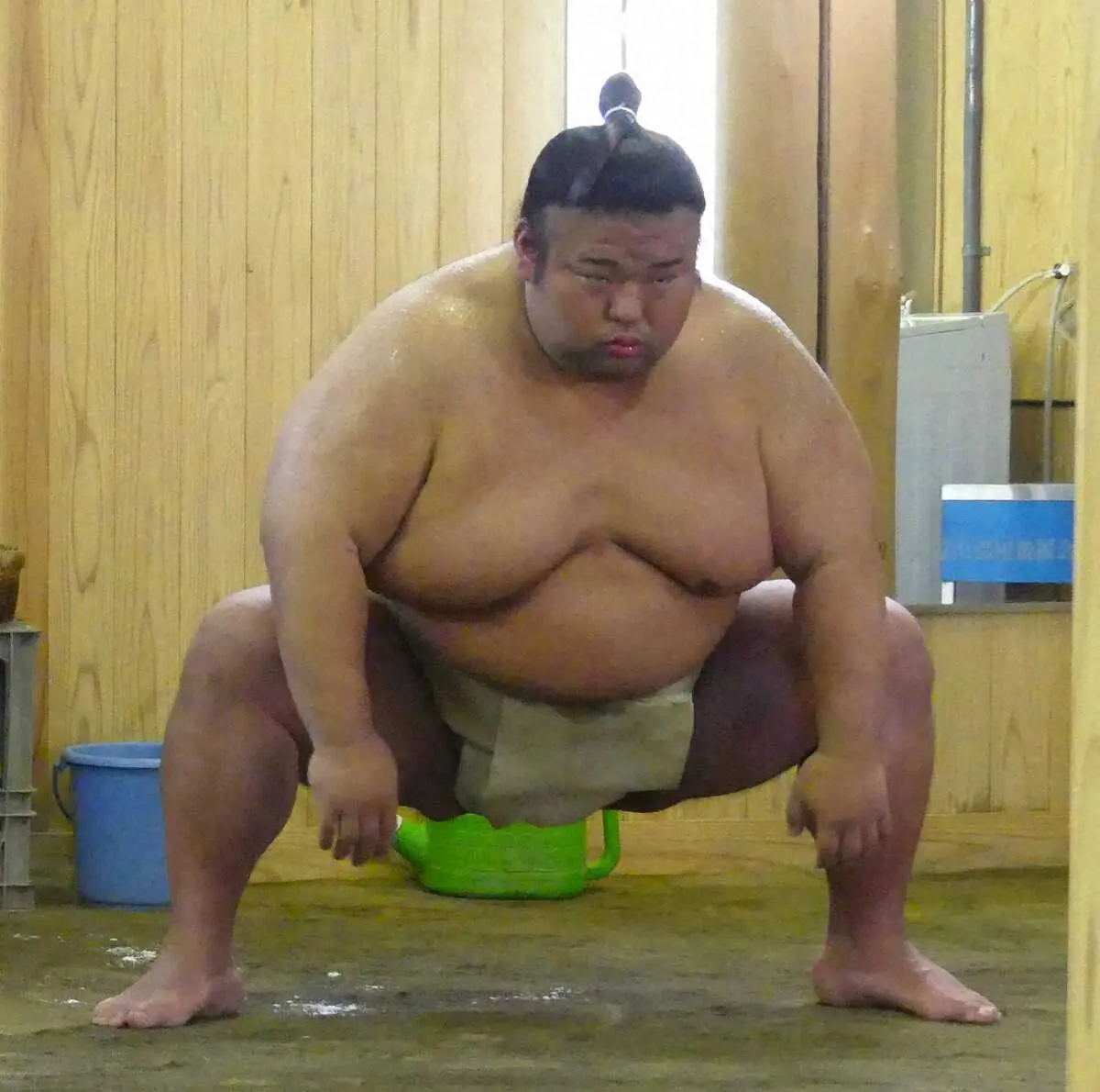 この日は土俵内には入らず基礎運動に注力。テーピングは巻かず、時間をかけてゆっくり四股、すり足、鉄砲で汗を流した。最後に弟弟子の幕下・若ノ勝(19)を相手に一丁押しを行って立ち合いの動きを確認した。