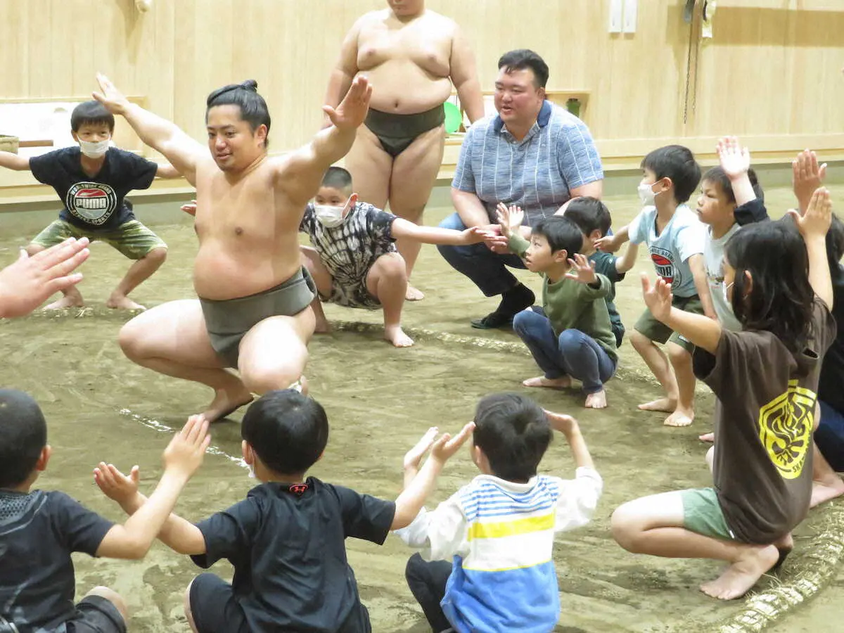 二所ノ関親方(元横綱・稀勢の里)は地域密着の部屋経営を目指しており「ようやく開催できるようになって良かった」と笑顔。稽古後にはすり足、一丁押しなどを土俵で体験してもらい「触れ合いを通じて少しでも相撲に興味を持ってもらえれば。今後も回数を増やしていきたい」と話した。