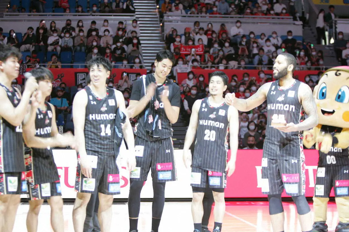 試合終了後にはコート上で今月22日に誕生日を迎えるディージェイ・ニュービル主将(30)にサプライズでバースデーケーキを渡し、チームメート全員で祝って今季を締めくくった。