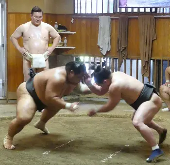 ぶつかり稽古で向中野(左)に胸を出す落合(中央)。右は北青鵬