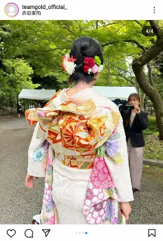 11日に更新された「team GOLD」インスタグラムでは、高木の華やかな総絞りの振り袖姿のショット4枚を公開。「Mihoが北京五輪の成績を受けて、春の褒章で紫綬褒章を受章しまして、園遊会にお招き頂きました」と報告し、「前回は、他のスケート競技メンバーと一緒だったのですが、今回は一人なので少々心細そうでした あいにく雨も降って来たのですが、気をつけていってらっしゃい!!また今回も、藤娘きぬたや様にお着物・着付けをお手伝い頂きました。素敵なお着物ありがとうございました!」と記した。
