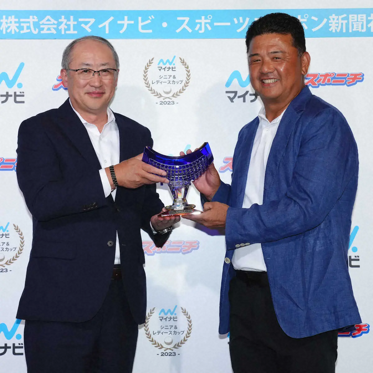 総合優勝を果たしマイナビ・土屋芳明代表取締役社長執行役員(左)と優勝杯を手に笑顔を見せる寺西(撮影・西尾 大助)