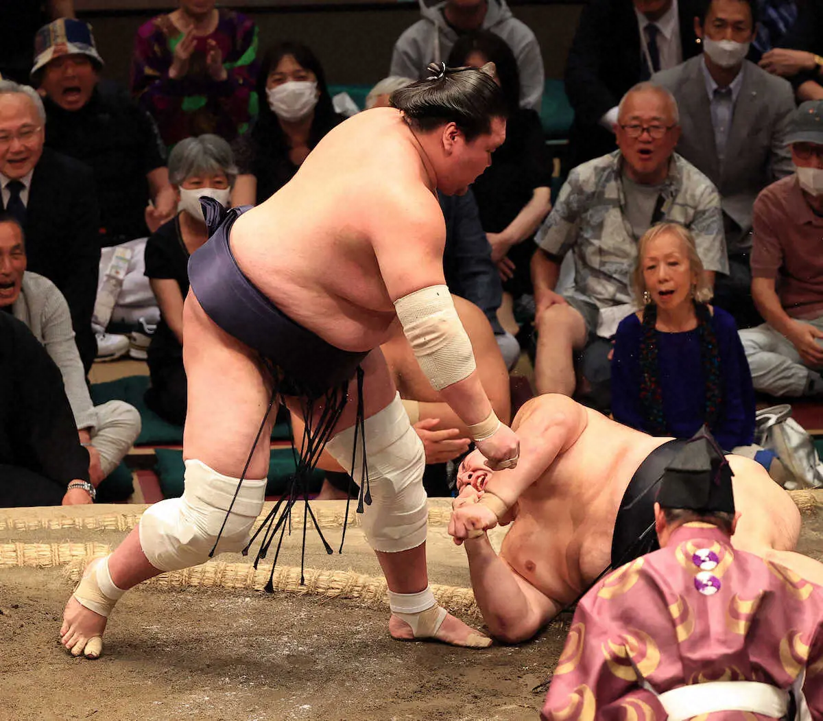 霧馬山は初顔合わせの前頭11枚目・北青鵬(21=宮城野部屋)を外掛けで下し、ただ一人2敗を死守。大関の貴景勝(26=常盤山部屋)は、前頭6枚目の明生(27=立浪部屋)を送り出し8勝目。カド番脱出を決めた。
