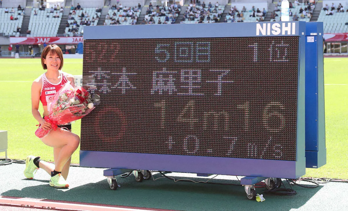 前日の大雨から一転、朝から晴れわたったヤンマースタジアム長居。森本は5本目で追い風0・7メートルの中、14メートル16を跳んだ。これで99年に花岡麻帆が出した14メートル04を上回り、24年ぶりに日本記録を更新した。