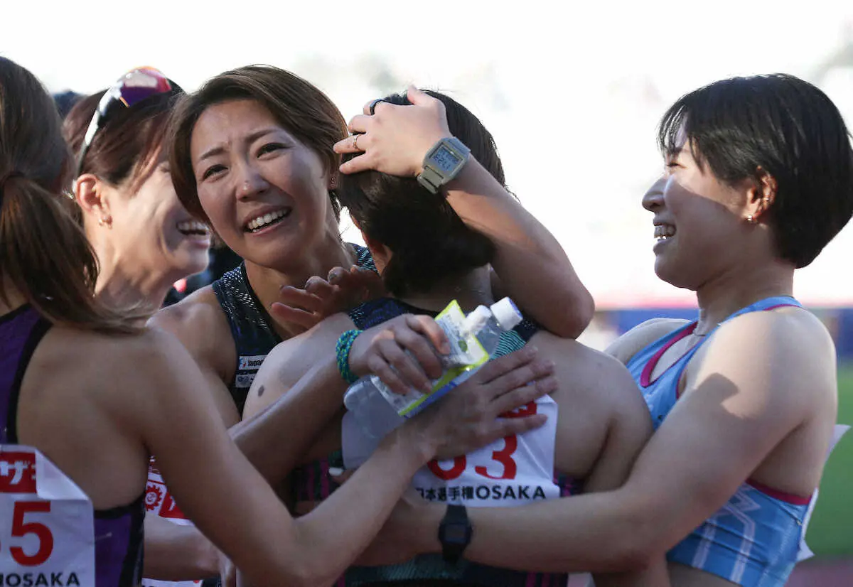 上位4選手が横一線でゴールに飛び込む大激戦。レース直後、速報を示す電光掲示板には福部真子(日本建設工業)に優勝と表示された。だが、その後に寺田の優勝、福部は0秒04差の4位で確定。泣き崩れる福部を寺田は優しく抱きしめた。