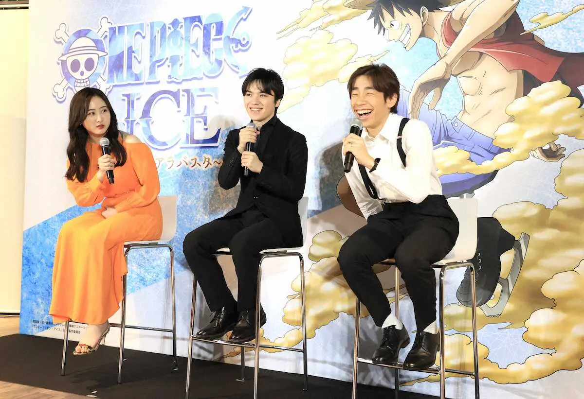 8、9月に横浜、名古屋で開催されるフィギュアスケートのアイスショー「ワンピース・オン・アイス~エピソード・オブ・アラバスタ~」の記者会見が8日、都内で開催された。主役のモンキー・D・ルフィを演じる男子で世界選手権2連覇の宇野昌磨(トヨタ自動車)、ウソップ役の織田信成、ナミ役の本田望結が登壇。キャラクターがスケート靴を履いた書き下ろしのメインビジュアルも公開された。