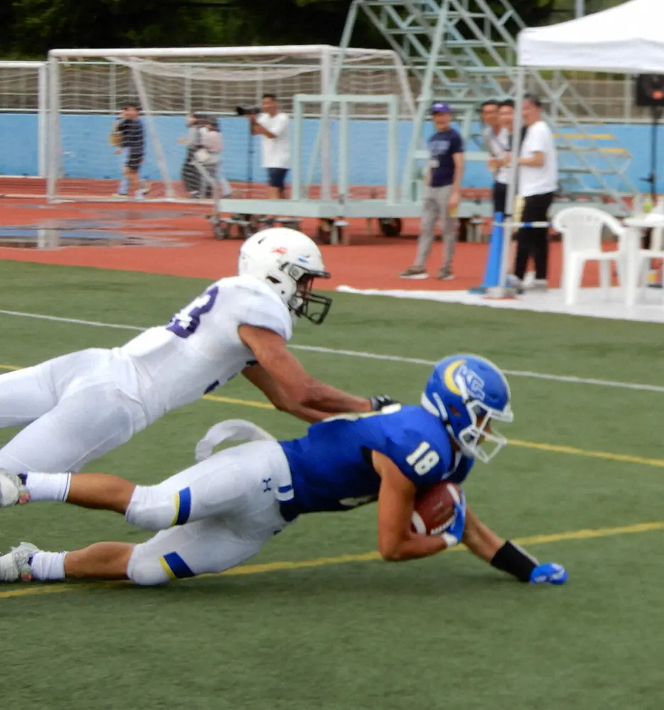 プレーコールを聞いて、関学大WR小段天響(1年)は燃えた。「(鈴木)崇与さんが先にTDを取っていたので、サイドラインで“次は自分も”と言っていました」。13―0とリードした第4Q6分55秒。QB星野秀太(2年)が右サイドを駆け上がる背番号18へボールを目がける。CBとの1対1。競り合いなら負けない。いや、負けるつもりはない。渾身のダイビングキャッチ。40ヤードのTDパスに、テールゲートパーティーでお祭りムードのメインスタンドが沸いた。