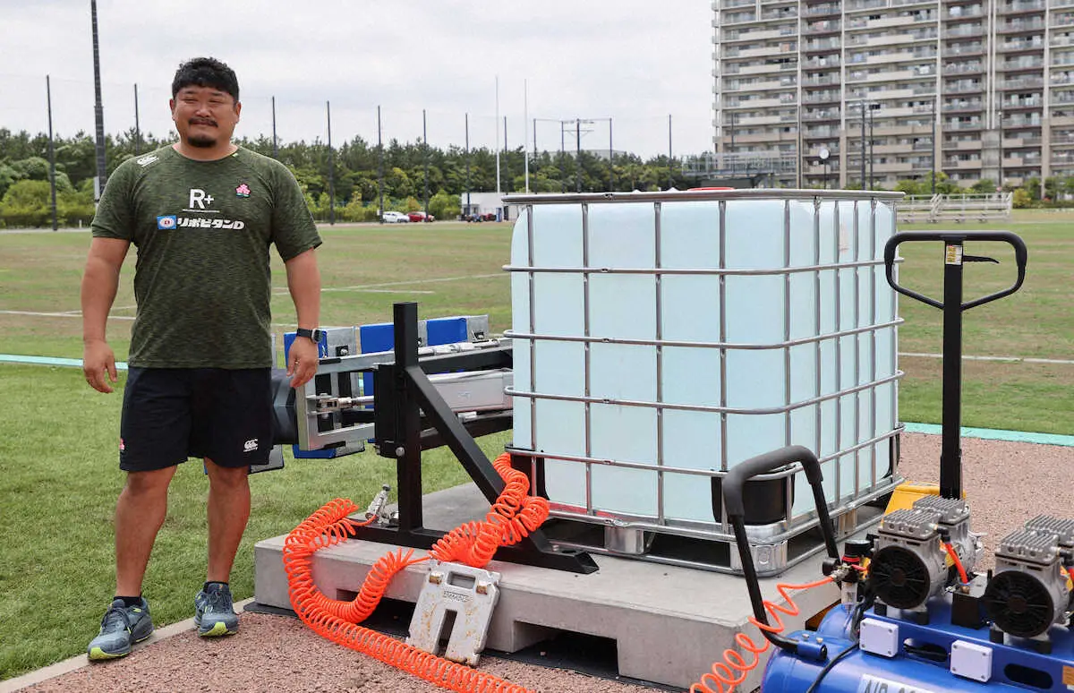 マシン単体の重さ200キロは国内で流通しているものと大差はないが、地面に固定するために設置されたコンクリートの平板、Amazonで購入したというポリタンクに水を入れると総重量2・8トン。最大の特徴は空気圧により、パッド部分が押し返してくることだ。スクラム担当の長谷川慎コーチは「日本にここだけ」と説明し、FW第3列の姫野和樹(トヨタ)は「圧がかかってきて、対人のようなイメージでできる」と好感触を得ている。