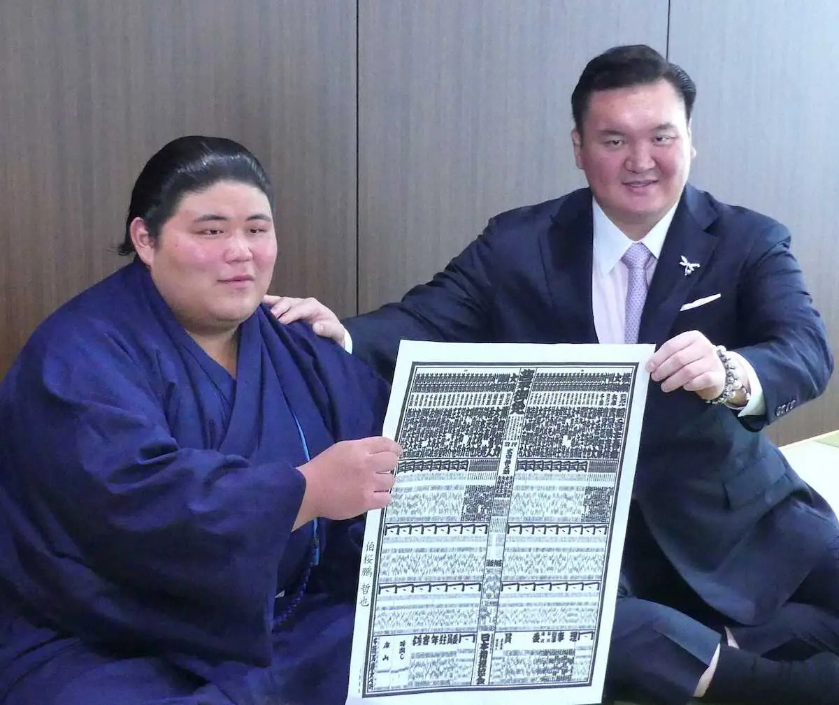 最上段に太い字で「伯桜鵬」と書かれた番付表を手に「改めて新入幕できたうれしさと、これからもっと厳しくなると言う覚悟を持った」と心境を語った。初土俵から所要3場所は、遠藤(現・幕内)と並ぶ昭和以降1位の最速記録。新十両に続いて2つ目の最速記録を打ち立てた“令和の怪物”は「自分でも思ってなかったぐらい順調すぎると思うけど、これからはそう甘くない」と気を引き締めた。「いろいろな方にお祝いメッセージをいただいてうれしいけど、絶対に自分が勘違いしてはいけない。調子に乗ってはいけないということを肝に銘じて頑張っていくことが自分の務め」。10代とは思えない落ち着きで謙虚に話し、幕内力士の風格を漂わせた。