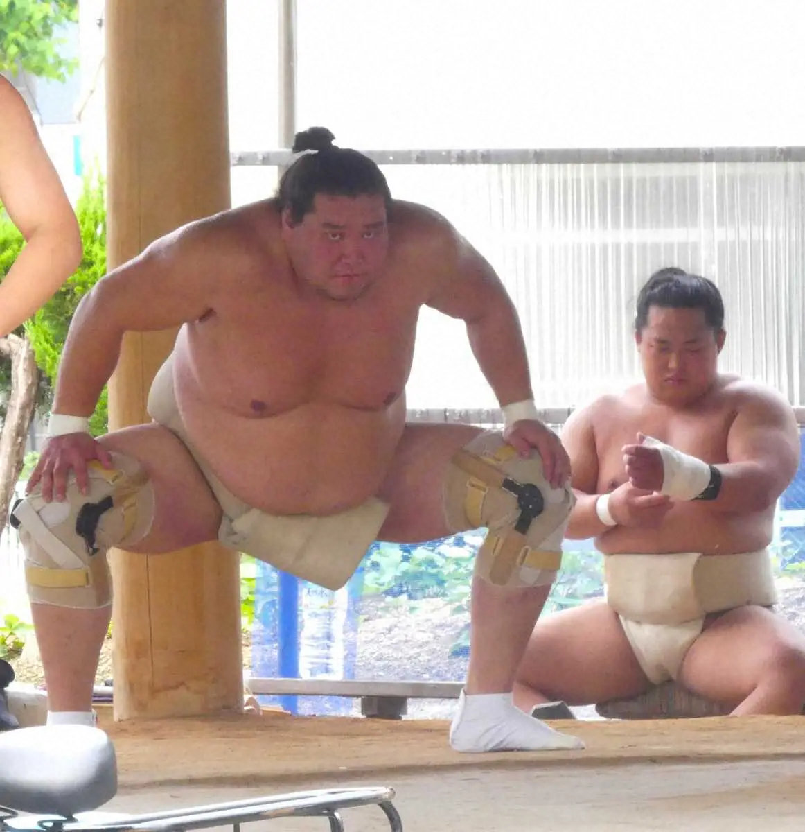 早い時間から稽古場に姿を現すと、両膝に装具を施して四股などの基礎運動や上半身の筋力トレーニングで汗を流した。この日は申し合い稽古には参加せず。最後に幕内・宝富士(36)を相手にぶつかり稽古を行った。稽古後は近所の園児たちと交流。自ら土俵に上がって笑顔で園児たちと相撲を取って楽しんだ。