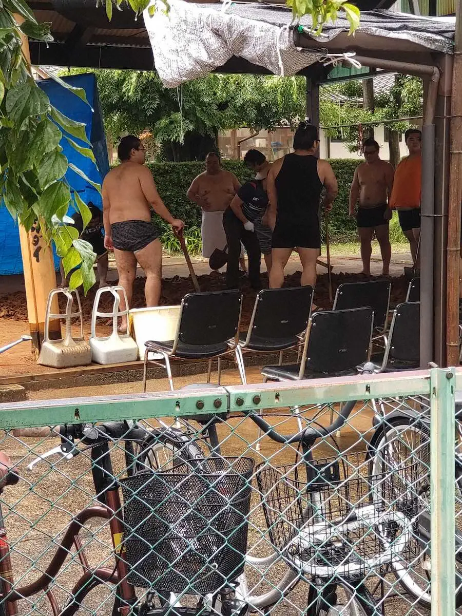 部屋総出で復旧作業に当たったが、足元の悪い土俵で熱のこもった稽古はかなわないと判断し、稽古を休んだ。朝乃山は「朝起きたら水浸しだった。こんなことは初めてで、しばらくは使えないですね」と困惑顔。再入幕した先場所で12勝し、2年ぶりの上位総当たりが予想されるが、30日以降は出稽古せざるを得ず、早速対応に追われた。