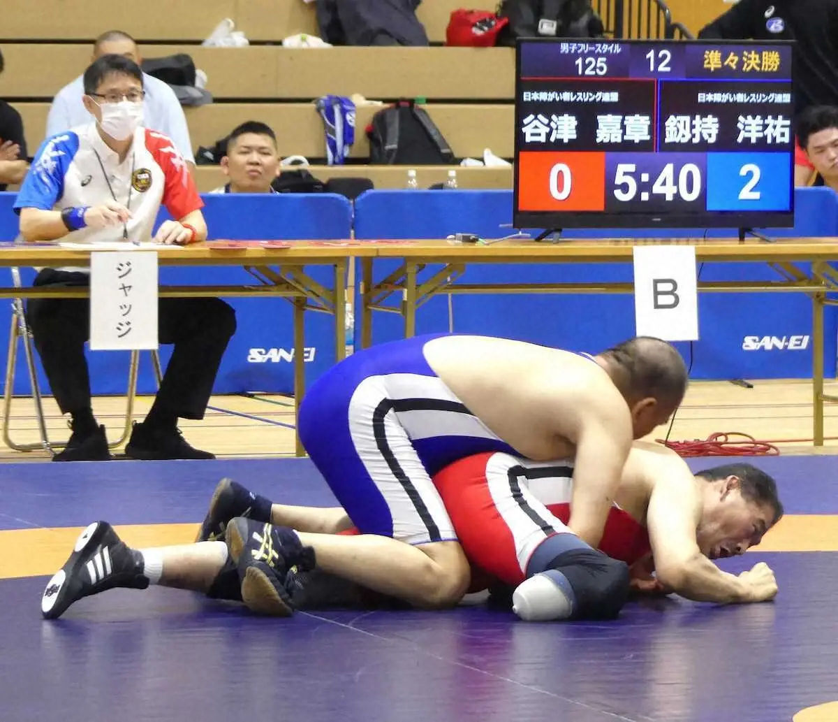 谷津は1976年モントリオール五輪90キロ級8位、全日本選手権で6度優勝などの実績を持つ。その後はプロレスでも活躍したが、19年6月に糖尿病の影響で右膝から下を切断した。今年3月に自身が設立した「日本障がい者レスリング連盟」所属で、37年ぶりとなるレスリングの公式戦に出場した。
