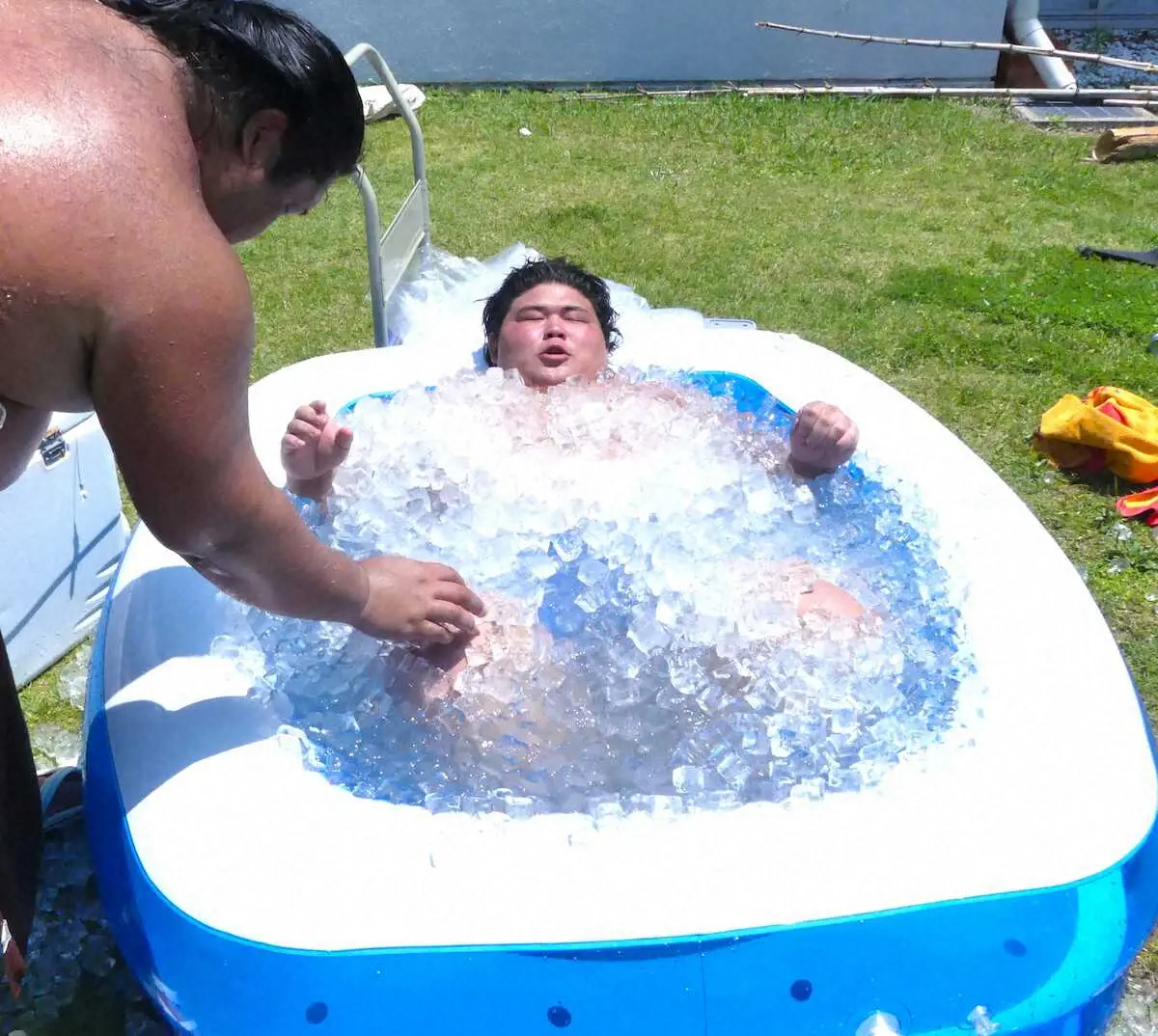 稽古後には、大量の氷が入ったアイスバスに漬かった。6月に現役を引退した間垣親方(元幕内・石浦)の発案で導入。アイシングによる筋肉痛の軽減や、一時的に収縮した血管が戻る時に広がって血行が促進されることで体にたまった老廃物や乳酸を排出させる働きがあるという。