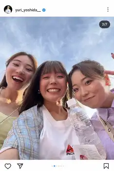 吉田優利 ミニスカ私服姿で世界水泳満喫「自分のパワーに変えたい」渋沢莉絵留、後藤未有と3ショット