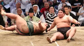 <大相撲名古屋場所13日目>遠藤(左)を寄り切りで破る北勝富士(撮影・椎名 航)
