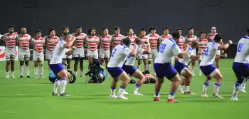 ラグビーサモア代表、日本戦キックオフ前に恒例儀式「シバタウ」披露 北の大地で迫力の舞