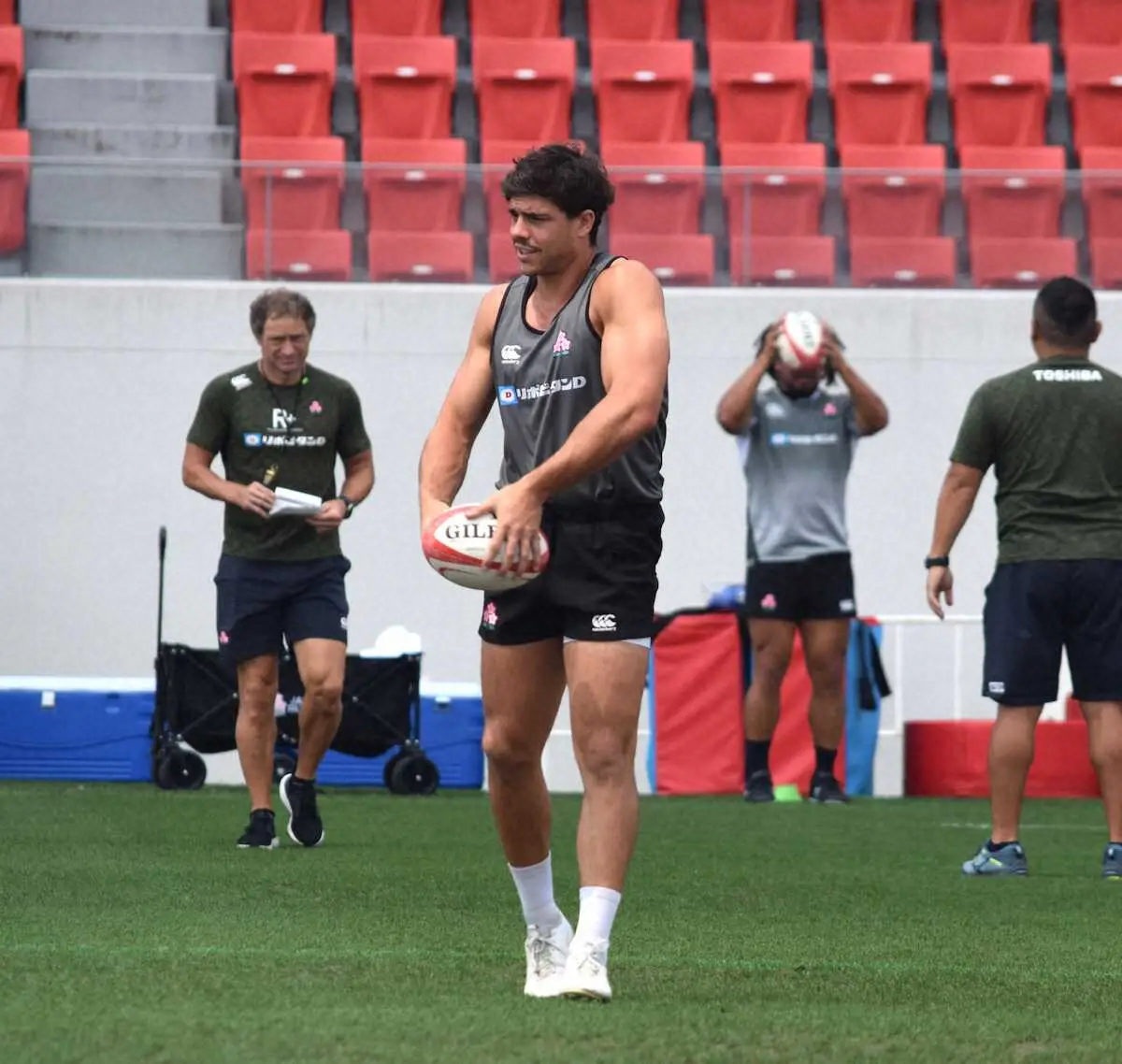 日本代表は28日、会場となる花園ラグビー場で前日練習を実施。午前中ながら気温が30度を超える酷暑の中、報道陣に公開した約15分の間には、ウオーミングアップやボールゲームを行い、翌日に迫ったトンガ戦に備えた。
