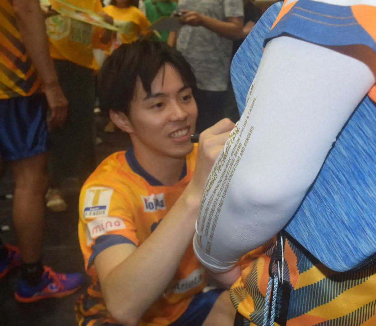 <静岡・琉球>試合後に来場者にサインする龍崎。