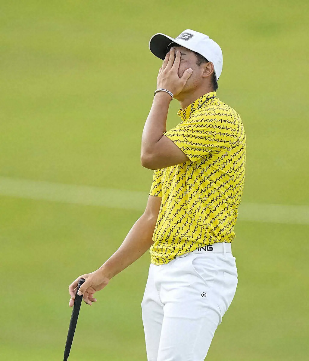 18番でバーディーパットを外し、顔を覆う蝉川(共同)