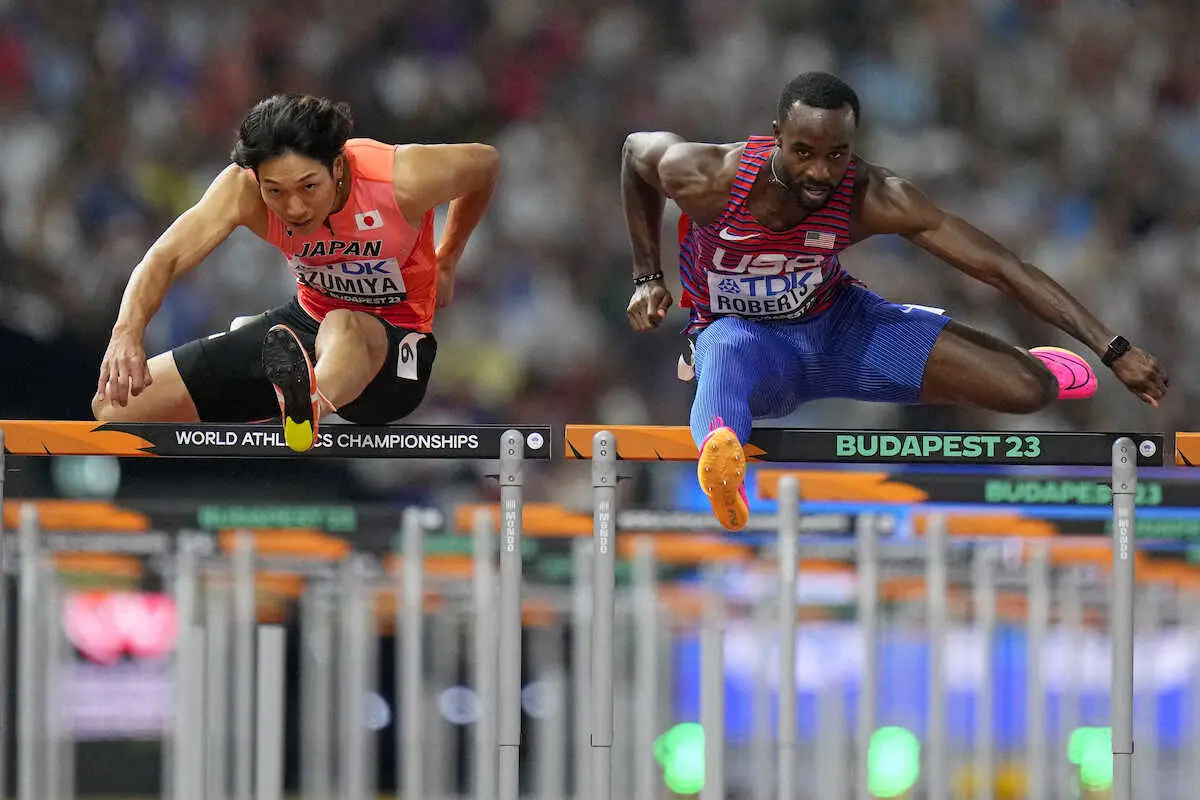 男子110メートル障害準決勝。先頭を巡って競り合う泉谷(左)と米国のロバーツ(AP)