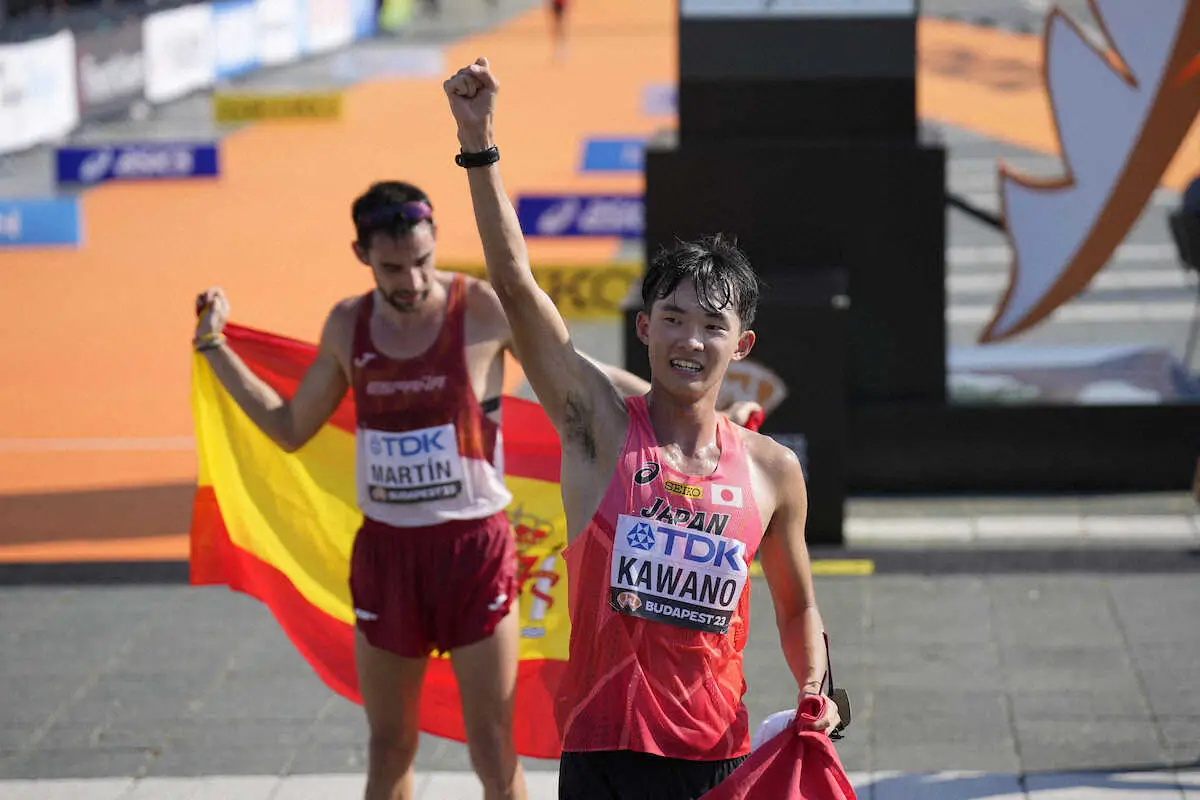 川野は昨年のオレゴン大会、残り2キロでイタリアのスタノと一騎打ちに。1秒差で敗れ、ゴール直後に崩れ落ちた。悔しさのあまり地面に打ち付けた右手は、この日、天へ高々と突きあげられていた。