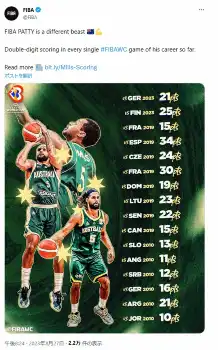 ミルズは1次リーグのフィンランド戦でも25得点をマーク。この試合も32分出場して、21得点をマークした。試合後にFIBAの公式X(旧ツイッター)ではミルズがこれまでのキャリアで出場したW杯の全試合で2桁得点をマークしたとポストした。