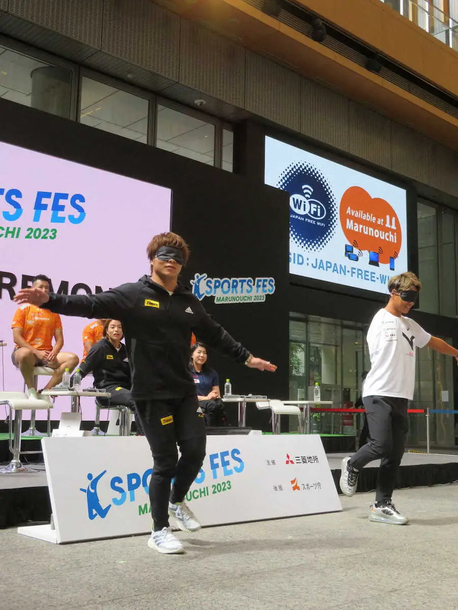 「MARUNOUCHI SPORTS FES 2023」のオープニングセレモニーで、閉眼片足立ちに挑戦する阿部一二三と宇田秀生
