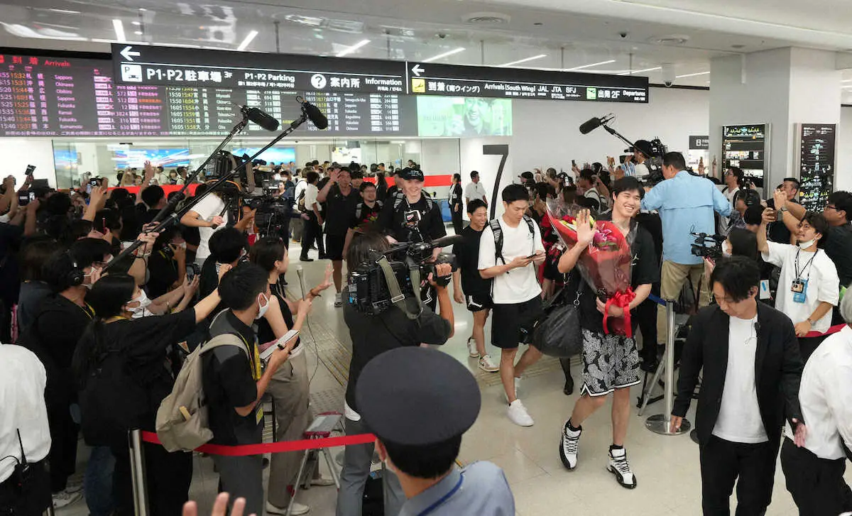<バスケ日本代表羽田空港到着>羽田空港へ到着し、大勢のファンに迎えられる渡辺(右)らバスケ日本代表の選手たち(撮影・木村 揚輔)