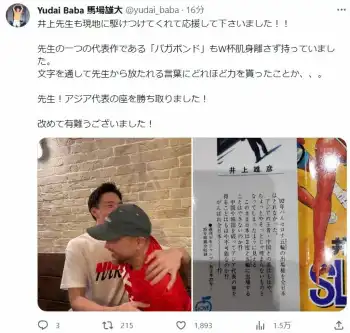 馬場雄大 スラダン作者・井上雄彦氏と熱いハグ「先生から放たれる言葉にどれほど力を貰ったことか」