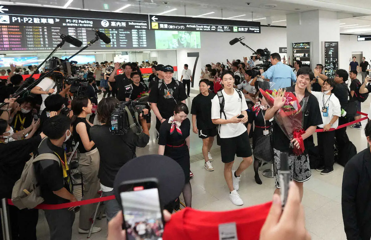 バスケットボール男子W杯で来夏のパリ五輪出場権を獲得した日本代表が4日、沖縄から帰京した。羽田空港に約500人のファンが出迎える中、選手団の先頭で花束を手に登場した渡辺は、笑顔で両手を振って声援に応えた。
