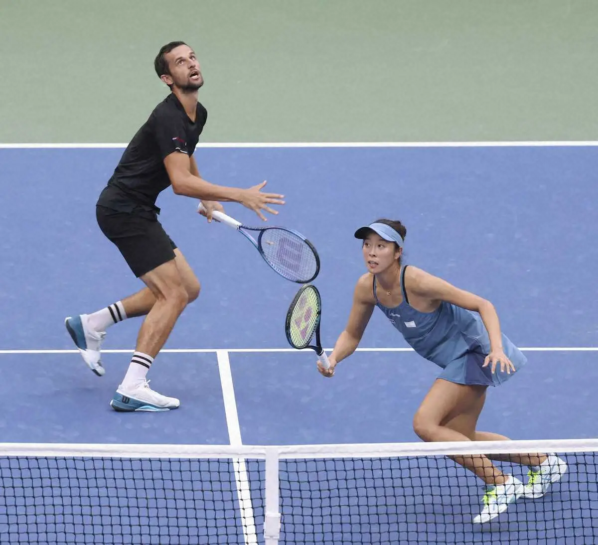 混合ダブルス準決勝でプレーする柴原瑛菜(右)、マテ・パビッチ組=ニューヨーク(共同)