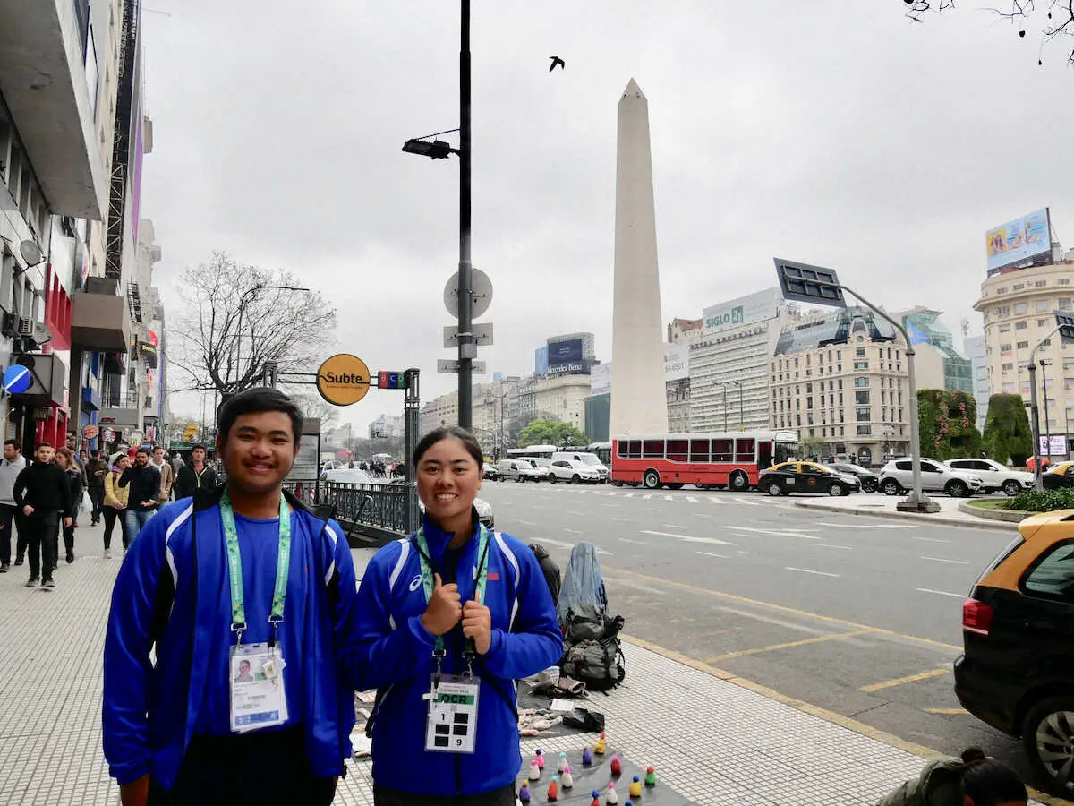 18年アルゼンチンで開催されたユース五輪の混合ダブルスに出場したコーパス(左)と笹生(家族提供)