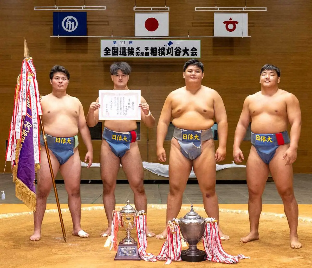 3人制で行われた団体戦は、日大と日体大が決勝で対戦。1―1で迎えた大将戦、日体大・ブフチョローン(3年)が左差しから日大・川渕一意(4年)の引きに乗じて一気に前に出て押し出した。日体大は今季初めての団体優勝。東日本選手権、金沢大会、十和田大会の3位入賞がここまでの最高成績だったため、決勝進出も今季初だった。