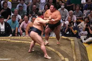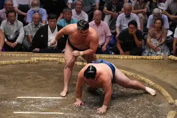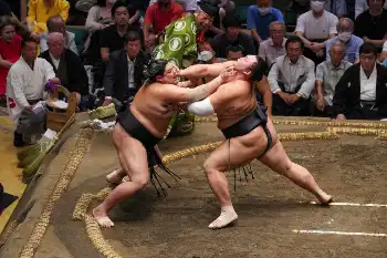 十両では、2年連続アマチュア横綱の大の里が輝鵬をはたき込みで下し、勝ち越しに王手をかける7連勝を飾った。