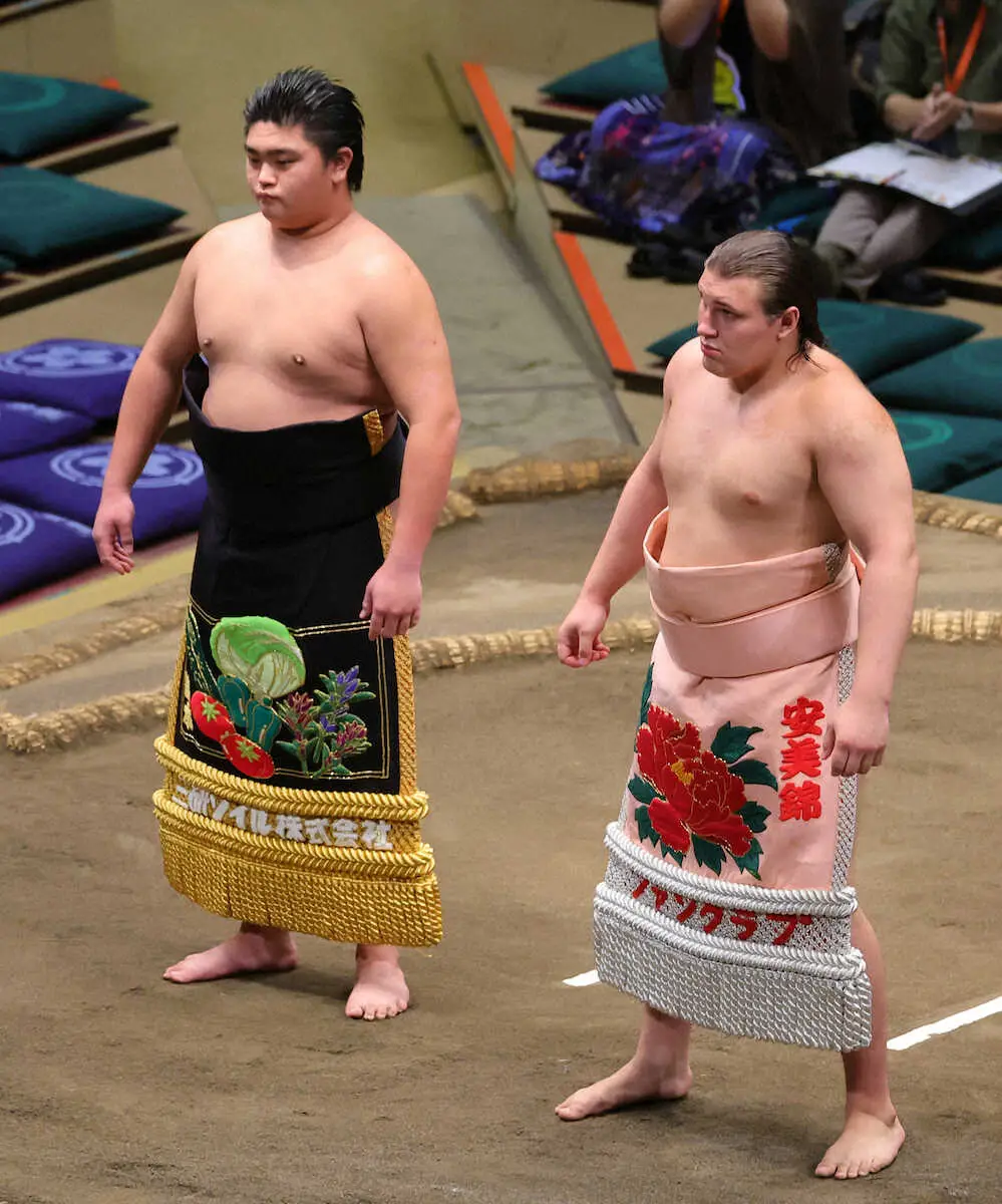 圧倒的な力で前相撲を3戦全勝したウクライナ出身の安青錦(あおにしき、19=安治川部屋)は、師匠の安治川親方(元関脇・安美錦)が現役時に使用した化粧まわしを締めて土俵に上がった。